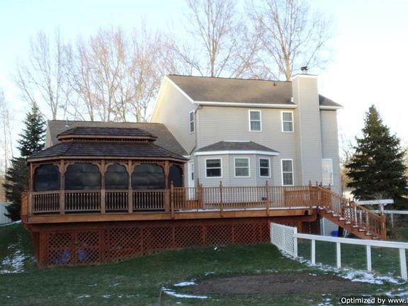 Wonderful 4 Bedroom & 2.5 Bath Colonial set on 1.6 acres! Covered front porch welcomes you into the 2-story Foyer entrance with hardwood floors. Formal Living Room and Family Room with fireplace open to Dining Room with French doors. Updated Eat-in Kitchen with Kraftmaid cabinets, Corian counters, center island breakfast bar with cooktop & bar sink, recessed lighting, ceramic floors & stainless steel appliances. Remodeled 1st floor Master Bedroom with engineered wood floors, private updated full bath, walk-in closet & new slider to deck. Second level includes 3 large bedrooms, full bath & open loft area. 1st floor Laundry Room. Full finished walk-out lower level Rec/Room, hobby/craft room, storage area & sliders to patio and large fenced-in area & pond. Several newer 1st floor windows & doors. New heat pump/central air, water softener & filtration system. Enjoy your morning coffee or watch the sun set from the expansive wood deck with 20x10 enclosed gazebo, newly built in 2015. 2-car attached garage & storage shed. 1-yr Home Warranty.