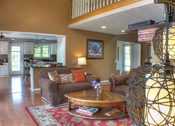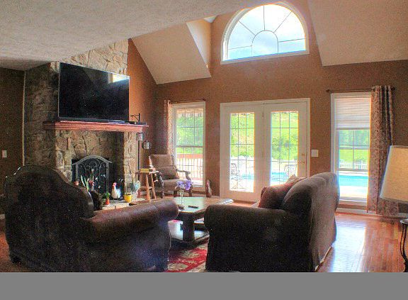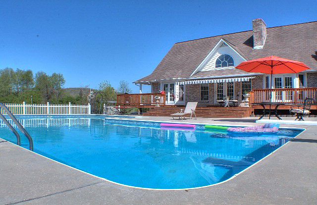 Tucked off the road in one of the prettiest valleys around, this open-floor-plan beauty takes advantage of the scenery with style and comfort. Windows across the kitchen, living room, and MBR frame the gorgeous in-ground pool and surrounding hills. Updated kitchen with granite counters opens to living room with cathedral ceiling, stone FP, and French doors to deck and pool. Main level MBR with updated bath also opens to the deck and pool. Main level office/guest room has attached full bath. Spacious 2nd level BRs step out to catwalk overlooking living room with its wall of windows. Seller/paper artists basement workshop with adjacent storage room could be exercise room or office. Hardwood or tile on main level, new carpet, new paint, stainless appliances, barn for storage or hobbies, wrap-around porches - all enhance the comfortable floor plan and beautiful setting of this home.