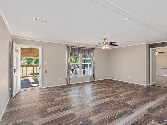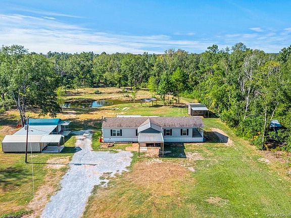 Situated on approximately 4 acres in Ragley, this residence boasts four bedrooms and 2 baths. Among its notable attributes are a dedicated pet spa, a spacious laundry room, a generously sized master shower with a walk-in design and double vanities in the master bath. Enjoy an integrated open layout encompassing the kitchen, living room, and dining areas. The kitchen features an inviting eat-in island, and ample storage space is readily available. There are 2 storage buildings which are 12' X 24' each, with electricity, situated on a concrete slab and are connected with an awning. Also, behind the home, is a 12 X 16 garden shed and a large pond that is 30' deep on one end. Additionally, the property is in Flood Zone X. The serial number is SFW019336TXAB. Please note that all measurements are +/-. Call today for your showing. Must see to appreciate all this homestead has to offer!