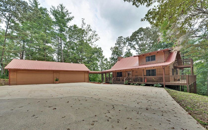 Private mountain log home tucked away on heavily wooded 5.5 acre estate lot and only 2.5 miles from dowtown Ellijay. Solid 6x12 dove-tail log construction with metal roof and wrap around decking with seasonal mountain views, 3 finished levels with approx 2400 square feet, and 24x40 4-car detached garage/worshop. The main level features a vaulted great room with lodge fireplace, exposed beams, and pine floor, chef's kitchen with tons of counter space and oversized custom island with veggie sink. The upper level loft is a great spot for a home office or reading nook and is adjacent to the master suite with private deck. The fully finished lower level has a media room, bed/bath, laundry, and oversized utility storage area. Perfect for full time living.