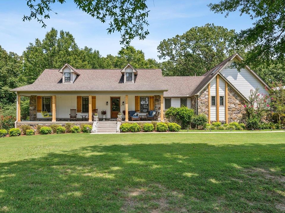 Beautiful home on 15.61 acres! Country front porch, 833 sq ft guest house w/26x50 RV pad, metal roof, outside storage; she-shed; plus 24x40 workshop w/3 overhead doors. Main home has split plan, primary BR w/salon BA, 3 more BRs and guest bath down; 5th BR w/half BA and loft area up. Great room w/gas fireplace, formal dining, spacious kitchen w/granite, stainless steel, gas stove. Laundry rm w/cabinets and granite counter, deck, patio, gazebo, firepit, landscaped
