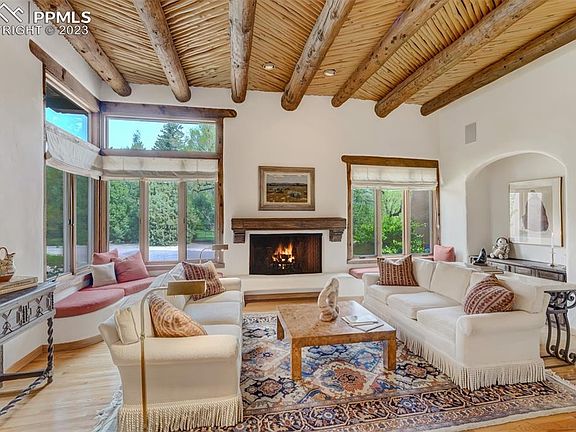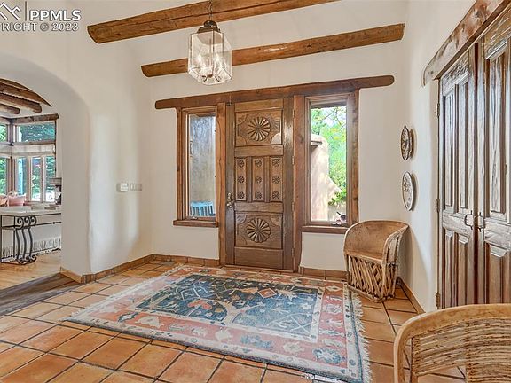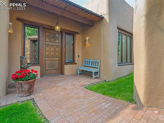 This beautiful adobe home is a true masterpiece of Pueblo Revival Architecture, reflecting the rich culture & heritage of the Southwest. Designed by renowned Sante Fe Architect, John Midyette & built in the style of John Gaw Meem, this home represents a perfect blend of authentic construction techniques & contemporary amenities. As you enter you are greeted by hand plastered rounded edged walls, Viga beamed ceilings with latillas placed in herringbone pattern between the Vigas, plaster cove ceilings, hand carved stone ox-eye windows, built-in benches, carved niches for art display, heavy wooden handmade/carved doors that all give the home a distinctive southwestern character. The deep window & door openings, along w/ Marvin wood framed, triple glazed & clad windows invite natural light into the home. The seven corner Beehive fireplaces, w/ 5 interior fireplaces (living rm, primary bed, family rm, 2nd & 3rd beds) & the two outside of the home offer warmth & comfort. The floors are made of brick, wood, carpet, or Saltillo tile offer a variety of textures & finishes adding to the overall charm of the home. The stepped levels, rounded copper parapets w/ canals, hand cut decorative corbels, outside patios held up by posts & the custom wood garage doors add to the aesthetic of the home. The ceilings are unique- the living room ceiling has peeled white aspen herringbone arranged in a herringbone pattern over heavy hand peeled pine vegas, the entrance, dining, family & primary bed/bath have hand plastered coving ceilings separated by heavy pine vegas, & the office & guest bedrooms ceilings have rough sawn planking in herring bone patterns. The adobe wall that surrounds the home & 100-year-old Mexican wrought iron gate entrance & handmade/carved outside gates, provide privacy. The driveway & parking boast 3,000 SF of adobe pavers laid March, 2023 & Derbigum roof replaced in 2019. True main level living w/ all the living space on the main level. This home is a work of art!