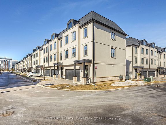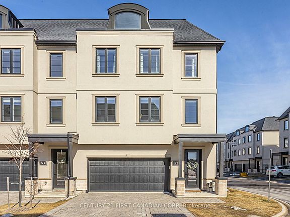 Low Maintenance Luxury in prestigious Sunningdale North where modern elegance meets thoughtful design. This home offers luxury, comfort, and sophistication, with a sun-filled, open-concept layout & organic White Oak throughout. Rich hardwood floors flow seamlessly & a premium linear fireplace becomes the center piece, complemented by custom White Oak floating shelves. The contemporary shaker-style kitchen features soft white upper cabinets & White Oak lower cabinetry, a spacious center island, and high-grade quartz countertops. The dining area is illuminated by a striking leather-and-brass drum-barrel light, perfect for elegant entertaining. A French pocket door leads to a premium butlers pantry, complete with a second fridge, dishwasher, sink & slate-tone cabinetry. Step outside to a private balcony with gas line, ideal for BBQs or a fire table. The main floor also includes a beautifully appointed powder room with a furniture-style vanity, pendant lighting & designer tile flooring. White Oak & metal spindle staircases lead to the upper level, where you'll find a convenient laundry room & three spacious bedrooms. The primary suite features a walk-in closet & a luxurious ensuite with heated towel bars, lighted mirrors, and a custom-tiled seated shower with twin niches. The 4-pc main bath continues the homes premium finishes. As an end unit, additional operational windows flood the home with even more natural light. The versatile ground level includes a bonus room with a patio door, 3pc bathroom, easily transitioning from a home gym or office to a 4th bedroom or separate suite. Additional upgrades include custom built-in storage shelves/drawers throughout, a mudroom closet with custom built-ins, Aerobarrier system for improved air quality, Nest Thermostat, Google Doorbell & a Flow-Through humidifier for enhanced comfort. With a private driveway, oversized double-car garage & meticulous attention to detail this is a rare find in an A+ location!