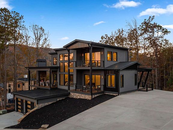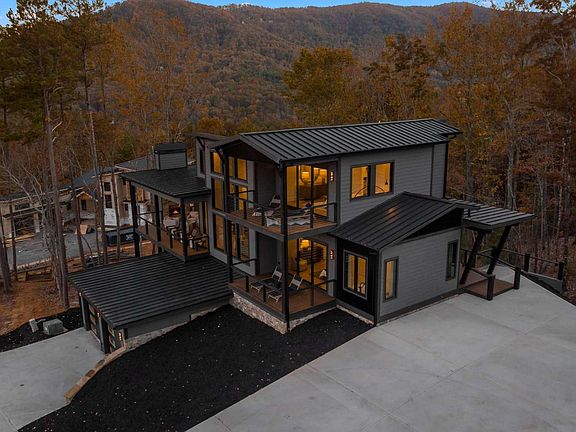 Mountain modern meets contemporary luxury in this chalet above the clouds. This new construction masterpiece is a custom design by architect Tony Boyatt. You'll find sleek, modern touches throughout the home, from the mono-slope roof lines to the floor to ceiling concrete fireplace in the great room. Expansive fixed glass windows optimize the views of the surrounding mountains & Lake Blue Ridge, bringing the natural light inside. The interior spaces blend materials from earthy and contemporary pallets creating a perfect combination. You will find upgraded appliances, minimum 10ft ceilings throughout & a custom interior design package by BH Interiors, leaving no detail out. Multiple decks and outdoor living space create the perfect environment to entertain - including a pass through garage door from the kitchen to the outside dining area. Being sold turn key, all this stunning home is missing, is you!
