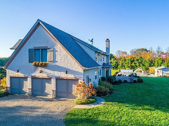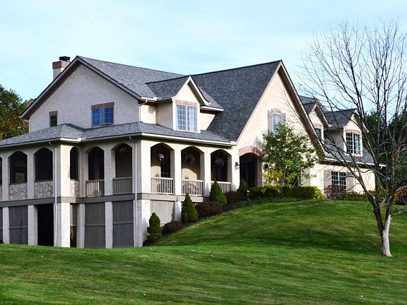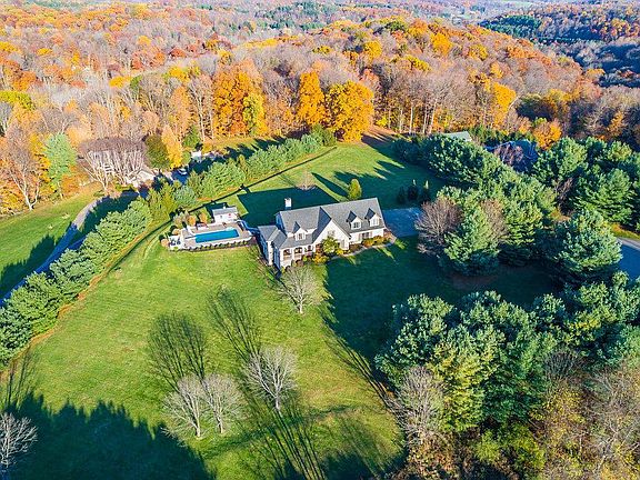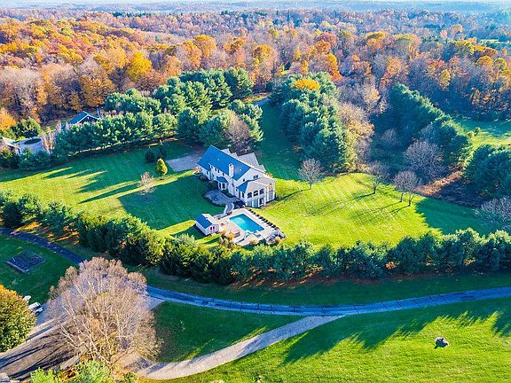French Country home on 5 acres. Rolling land offers spectacular views. Architectural details include: arches, wainscoting, crown molding, shutters, stone lintels, & multi-pane windows. The use of natural elements, deliberate lines & soft faded colors create an elegant, but comfortable home. Open FP on the main lvl gives a sense of rustic warmth; gourmet Kt w/custom cabinets, lrg island & SS apps; eat-in space; family rm w/ built-ins; den w/French drs; DR also on main lvl. Huge laundry rm & mud rm w/storage cubbies. 5 generous sized BR's on 2nd level, including the master suite, along w/another full BA. Lrg closet is stubbed for 3rd full BA up. Finished walkout LL has full bath and plenty of storage. Outdoor spaces; covered front porch, screened porch, patio, in-ground pool w/pool house.