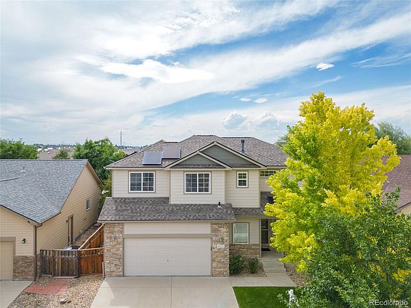 Nestled in the desirable Silver Peaks subdivision, this well-maintained two story home includes a rare finished basement! The front exterior greets you with a beautiful maple and a cozy front porch overlooking a wide street. Upon entering, enjoy a massive living room with vaulted ceilings, a recently finished gas fireplace, and plenty of sunlight. The laundry room is conveniently located on the top floor along with 3 spacious bedrooms, a full bath, and a 5 piece primary ensuite with a large walk-in closet. The finished basement provides ample space for an extra living room and bedroom while offering rough-in plumbing. The two car garage has built in shelving and an extra workspace or storage nook. The backyard is lined with aspens and thoughtful landscaping, a shed with solar lighting, and an above ground pool/hot tub (inclusions or exclusions). Recent upgrades include: refrigerator (see private remarks), hot water heater, ceiling fans, interior paint in multiple rooms, smart thermostat, bathroom fixtures, main level flooring, and roof (2019). Several parks including Ramada Park are within walking distance. King Soopers and Prairie View Shopping Center are a short drive to meet all your daily needs. Solar panels are owned and paid off.