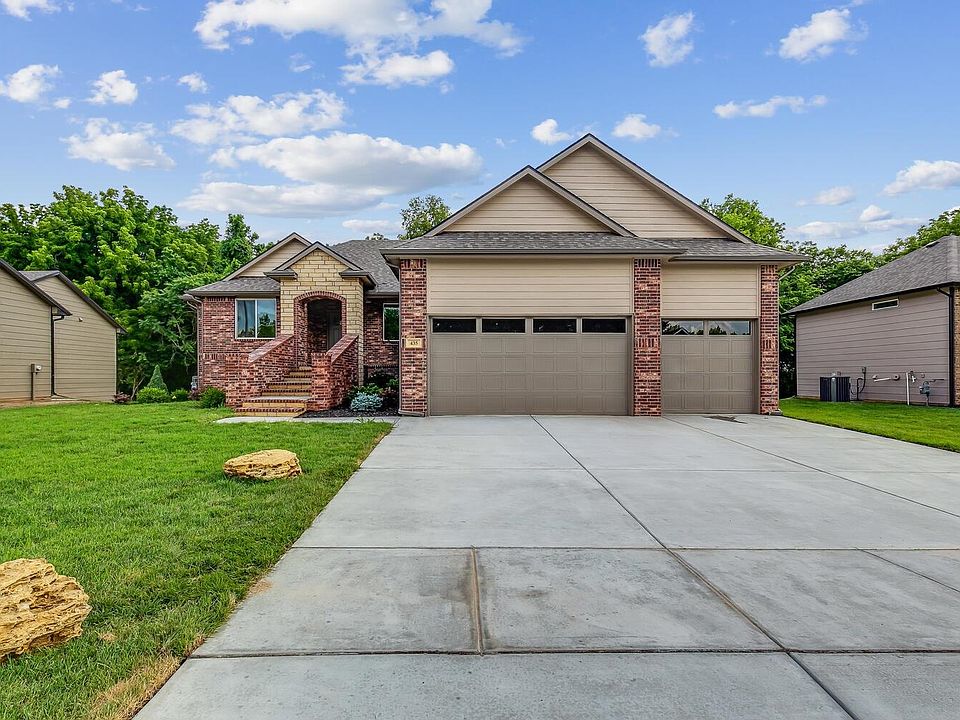 READY TO SELL, BRING YOUR BEST OFFER. Brand New Home Located At Captivating Timber Creek Estates in Haysville! As you venture towards the stone archway, you'll discover an entryway that leads to a beautiful open/split bedroom floor plan. With 10 ft. ceilings, it's hard not to fall in love with this space. The living area on the main level features stunning luxury wood laminate flooring. This residence consists of 5 bedrooms, 4 bathrooms, and an attached garage that can hold up to 3 cars. The electric fireplace in the living room is absolutely stunning and the large windows allow for natural light to fill the space. Step into the kitchen and you will be greeted with an open layout with a generously sized island, elegantly crafted with granite countertops and top-of-the-line stainless steel appliances. You'll also find a convenient walk-in pantry that provides ample storage space for all your cooking essentials. The master bedroom has a generous walk-in closet for all your storage needs. The master bathroom is equipped with a beautifully tiled shower for a luxurious experience. Additionally, there is a mudroom and a fully equipped hallway bathroom on the main level. Finished view out basement with 9 ft. ceiling and really nice built-ins. The second rec area has a nice wet bar as well. The covered deck looks out to the tree line that the property backs up to, giving you that extra bit of privacy. Call today to take your exclusive tour today!