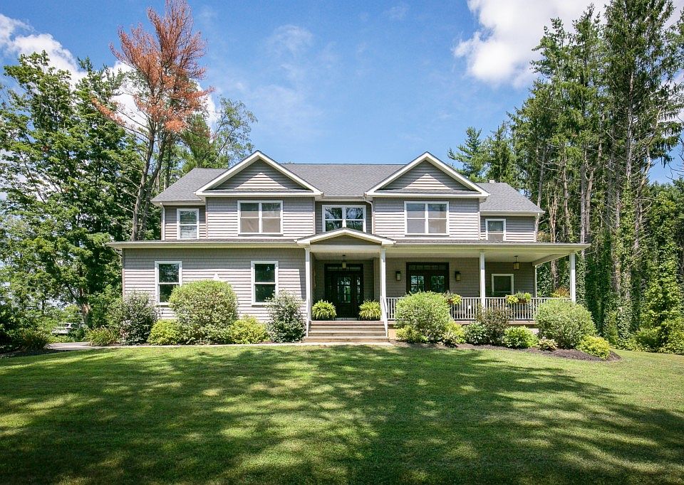 This stunning, custom-built home is truly a one of a kind in every way! Set on a beautiful wooded surrounded lot in the Historic town of Crosswicks, Chesterfield Township, this layout was extremely well thought out, and the design will immediately wow you. The wrap around front porch is a spot for the homeowner to enjoy the rural setting while working, enjoying their morning coffee, or an evening drink. As you enter the two-story foyer, you will be impressed by the beautiful neutral shades, custom molding and railings, obvious attention to detail, and honed slate flooring. To your right is the large dining room, featuring double french doors which open and step out onto the front porch. Towards the back of the home is the kitchen, which is sure to excite any culinary guru. Over-sized island with seating, modern farmhouse light fixtures and farm sink, breakfast nook, Thermador Professional Line appliances, maple wood cabinets, and both honed granite and Carrera marble countertops. To add to the uniqueness of this home, connected with the kitchen is the Keeping Room, with a wood burning fireplace and beautiful design. This room is open to the kitchen, adding an area for a beverage fridge, bar and additional cabinetry. Nicely tucked behind this area, is the laundry room, home office, and powder room all tastefully decorated. A walk in pantry is also located in this space. As for the Family Room, beautiful custom coffered 11 ft. ceiling, coupled with another wood burning fireplace is sure to scream coziness. A large bedroom with full bath completes the first floor. The second floor layout features a step up to an over 350 square ft Sitting Room, perfect to use as a game room that the whole family can enjoy. In addition, the master bedroom, large en-suite and walk-in closet will not disappoint. There are three additional bedrooms, and two full bathrooms. The buyer of this home can rest assured this is move-in and ready for entertaining! Let~s not forget the pocket doors on both the first and second floor, the transom windows throughout the first floor, all of the designer light fixtures for visual comfort, and USB plugs throughout the house. There are plenty of parks and playgrounds for the kids to play. This house is conveniently located within minutes to major access roads providing a simple commute to both NYC and Philadelphia.