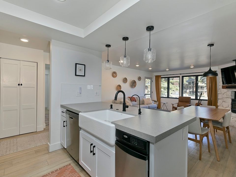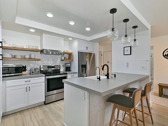 This mountain modern is completely remodeled and stunning! Located in an excellent location close to the Canyon Lodge and The Village at Mammoth with a shuttle stop just outside this property offering a spectacular location for summer and winter enjoyment. The unit has been redone from top to bottom with a stylish decor. High end wide plank Core Tech flooring throughout. The kitchen has brand new quartz countertops, apron sink, floating shelves, stainless appliances. Beautiful quartz vanities in the bathrooms with heated flooring. New furnishings with high end mattresses. This is a place you'll want to call your investment property and second home. Plenty of storage, in-unit washer-dryer, underground parking, a seasonal pool, and multiple hot tubs. Cable and internet is provided by the association via a bulk rate contract with Suddenlink. Parking for 2 cars is available, one spot is assigned and the second car can be parked in the unassigned parking.