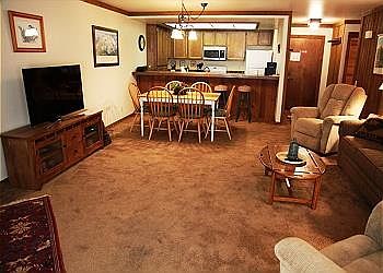 This pet-friendly 2 bedroom, 2 bathroom condo is just a short shuttle ride to Canyon Lodge and is spacious enough for the whole group. The unit features a brand new sleeper sofa couch and mattress (Winter 2015), gas fireplace, 50" flat screen HDTV with DVD player and DVR service (TiVo access to Netflix and Amazon Prime Video), private washer/dryer and free WiFi. The galley-style kitchen is equipped with all of the cookware and appliances you need to make this condo feel like home. The dining area has seating for 6 with an additional 2 at the bar. The master bedroom has a California King bed, a 28" flat screen TV and private bathroom with double vanity and large soaking tub. The second bedroom has 2 Twin beds, a 28" flat screen TV, a desk and shared bathroom right across the hall. In the living room there is also a Queen sleeper sofa for additional guests.