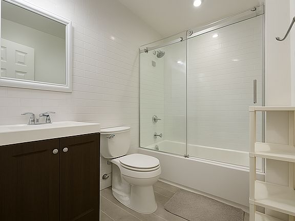 The residence offers three true bedrooms, each with its own closets and dual exposures for abundant sunlight. The primary suite features an ensuite bathroom and three oversized windows, creating a serene retreat within the home. Hardwood flooring, recessed lighting, and modern fixtures add elegance throughout, while a washer/dryer and independently controlled split AC units in every room provide everyday comfort.
