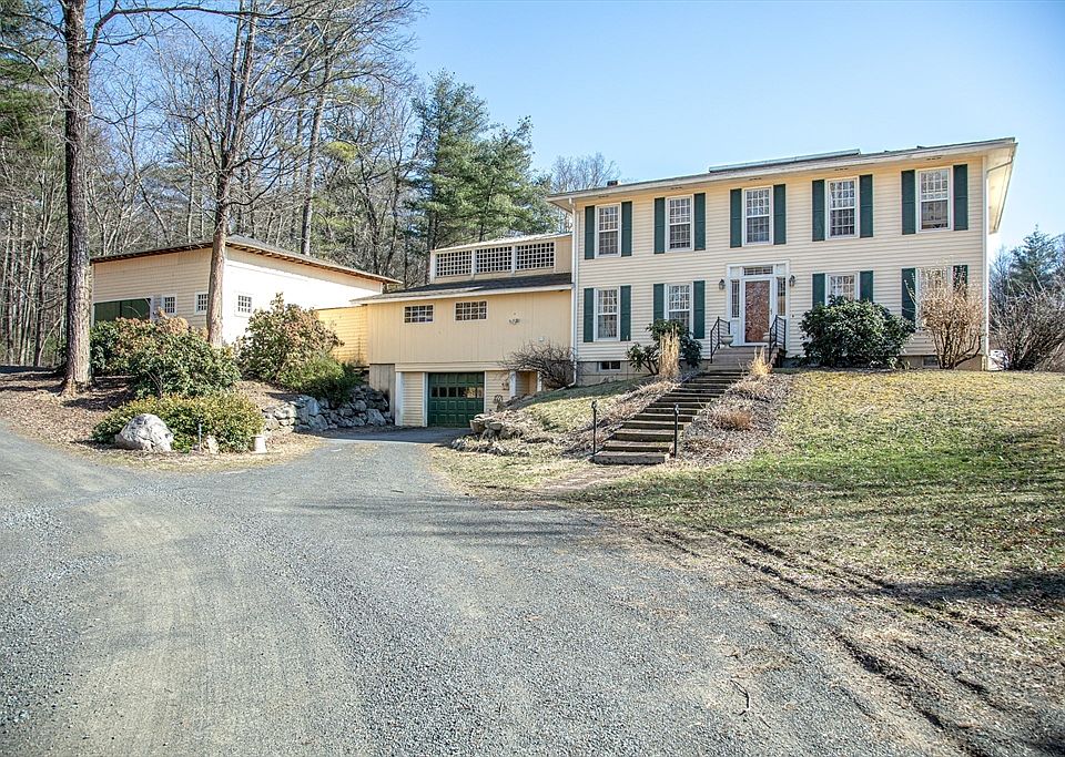 *Back on the market due to Buyer's job relocation. * The driveway winds along pasture bordered by apple trees and split-rail fencing to this welcoming Colonial. The home boasts an open-concept first floor featuring light-filled dining and living areas, higher-end kitchen appliances, and a wall of glass leading to a deck, private backyard, and hot tub. Cozy office, 1/2 bath, and laundry/mudroom complete the main floor. Upstairs, the primary suite offers a balcony, walk-in closet, and newly renovated full bath. Two more bedrooms upstairs adjoin an added full bath. Don’t miss the secret sleeping porch at the end of the hallway! The walk-out basement offers opportunities galore, with full bath, separate entrances, garage parking, and workspaces. Two more covered bays attach to the 2-stall horse barn. Other inclusions: solar panels, fenced-in paddock, established gardens, and excellent stargazing. Prime location, with direct access to horseback and hiking trails and just minutes to UMASS.