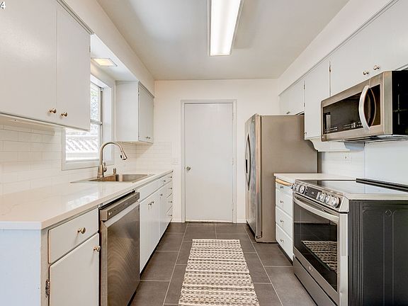Beautifully maintained home in the desirable Hazelwood neighborhood featuring hardwood floors throughout and a cozy living room with a wood-burning fireplace. Large picture windows flood the space with natural light. The remodeled kitchen has new LVT flooring, quartz countertops, a designer backsplash, and modern stainless steel appliances. The main level offers two bedrooms, and a remodeled hall bathroom. The upper floor provides two spacious bedrooms, one with a walk-in closet, both with sliding doors leading to a deck with scenic yard views, accompanied by a full bathroom. The basement includes a versatile bonus room, perfect for an office, a family room, and ample storage space. Upgraded features include a new heat pump for efficient central heating and air conditioning, updated plumbing, and an updated electrical panel. The property includes a single-car garage with a driveway and a separate detached 20x22 two-car garage/shop that is finished, with heating, cooling, and EV charger wiring. Additionally, a two-car carport and a separate gated driveway entrance offer convenience for car enthusiasts, RVs, or boat parking. Conveniently located near Glendoveer Golf Course, Ventura Park, Mall 205, bus lines, and easy freeway access. 96 bike score, and 76 walk score! [Home Energy Score = 4. HES Report at https://rpt.greenbuildingregistry.com/hes/OR10193588]