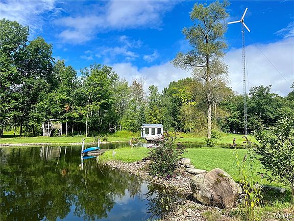 Here's your opportunity to own your own custom-built compound. What appears to be "business as usual" in the front, opens to a "sky's the limit" in the back! This 2007 ranch has 3-beds and 2.5-baths, an open floorplan with a kitchen, dining and living area, along with full access to the outside entertaining space. On the lower level the polished concrete heated floors are stunning as they run the entire space of the family room and in-house bar. There is a full slider walk-out to a Stampcrete patio from the lower level. If the interior hasn't won you over yet, the outside is a showstopper. The multi-tiered deck is perfect for multiple conversation areas. Enjoy the hybrid-inground pool or hot tub located off one of the decks. Also included is an artist's cabin, a screened in cabin overlooking the stocked pond, with a deck (perfect for feeding the fish). The 40x28 garage/barn has a concrete floor and office, with an upstairs for storage. The property also has a mobile on it that has been rented out to the same tenants for years at $650/mo., and a windmill that generates power for the property. 2536sf is the verified sqft. of the house from plans. 1445sf is the Real Property listing.