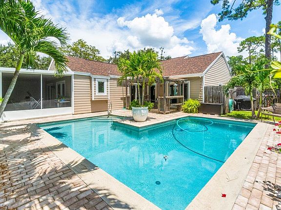 You will be impressed by this custom upgraded POOL home in desirable Tree Tops community. Pride of ownership really shows in this home. 3 bedrooms with possible room that can be 4th bedroom. 2 bath. 1,700 living square feet. IMPORTANT FEATURES : ROOF ONLY 4 YEARS OLD. WHOLE HOUSE IMPACT WINDOWS, IMPACT SKYLIGHT, SLIDING DOORS AND FRONT DOORS. SALT WATER POOL WITH NEW PUMP IN 2024. The living area has a tall ceiling with 12x 24 porcelain tile. Both bathrooms are nicely updated. Bamboo flooring in bedrooms. Recently painted interior and exterior. No popcorn ceilings. The kitchen has been upgraded with custom cabinets, granite countertops and stainless steel appliances. Loft area with custom built in office. Custom tool and work room. Covered screened patio plus pergola outside. Garage converted to possible 4th bedroom but can be converted back. Large tropical backyard with palm trees and potted plants throughout. AC unit is 2015. Water Heater is 2018. Freezer and stereo system stays. Right in the middle of Wellington with Top rated schools, all the equestrian activities, 5 minutes from the Wellington Mall, and 3 minutes from the Wellington Aquatic center, only 12 minutes from new developments being built Lotus Wellington and Tuttle Royale which will bring many new restaurants and entertainment options and only 25 minutes from the West Palm Beach Airport. Don't miss this one, it's a must see today!