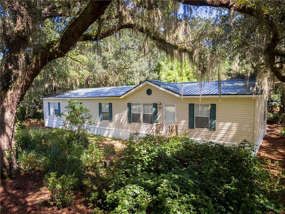 Incredible 4BR/2BA home located in the quaint community of Harriett's Bluff off Crooked River. This lovely 2009 Destiny Model is 32x80 and offers many custom features throughout. Split bedroom plan, walk-in closets, large front living room w/dining room, cozy den/keeping room with wood burning fireplace, dreamy open kitchen w/island and a super-sized laundry room complete with full counter, cabinets, sink & pantry. The master is quite spacious with french doors leading to an amazing en-suite offering a beautiful raised garden tub with stone accents, large walk-in shower w/bench, multiple cabinets and walk-in closet. Seller just added new metal roof and LVP flooring. Covered carport, 2 storage buildings, gazebo, koi pond and lush landscaping. Private well and septic. Public boat ramp and dock 3 blocks down. Can't beat this price and location...great for full time or vacation. Call for appointment.