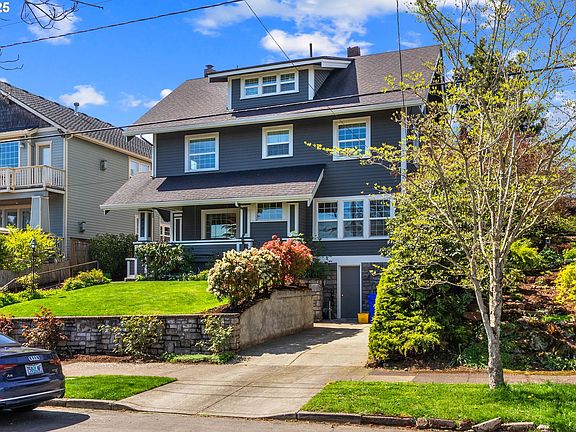 Unparalleled Mt Tabor Home! A one-of-a-kind property where historic charm meets modern lifestyle, this 1910 craftsman was thoughtfully updated and expanded in 2008 to offer over 4,500 square feet of living space while preserving its timeless character. Enjoy alpine glow views of Mt. Hood from this coveted location and the rare advantage of 6 bedrooms and 4 1/2 bathrooms providing ample accommodation. The spacious living room features a gas-heated fireplace and flows seamlessly into a formal dining room adorned with original paneling, built-ins, and elegant lighting enhanced by tall ceilings. A well-designed kitchen awaits with cherry cabinets, a prep island, stainless steel appliances, and a counter-depth refrigerator, complemented by an adjoining eating area and extra storage. A main-level office with a large closet and access to a full bathroom serves as an ideal long-term guestroom or private workspace. The bright second floor offers a versatile family room perfect for crafting or studying, two generous bedrooms sharing a bathroom with heated floors, and a grand primary suite boasting a huge walk-in closet, soaking tub, walk-in double-headed shower, and dual vanity. The third floor features an entertaining loft space, two more bedrooms, a full bathroom, and extra attic storage for holiday decorations. The finished basement provides a second fridge and sink setup, workout space, a paneled study or office, and ample storage. Modern upgrades include full insulation during the remodel, radiant heat, a heat pump to keep upper levels cool, and an internal sprinkler system. Outdoors, the level backyard is designed for entertaining with a patio, hot tub, and garden area—all fully fenced. The driveway parking spot comes equipped with an EV charger, while high-end exterior paint (two years ago) enhances curb appeal. Come enjoy gorgeous sunrises while relaxing on your porch swing. See our virtual tour links for more info and tour scheduling! [Home Energy Score = 1. HES Report at https://rpt.greenbuildingregistry.com/hes/OR10237572]