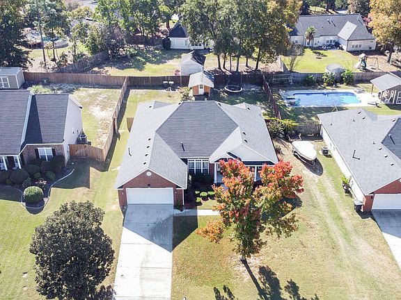 Experience the ease of living in a single-story home with this fabulous approx 2,400 sq ft home in the desirable Butlers Mill neighborhood! All 4 bedrooms, 3 full baths, and the office are conveniently arranged on a single main level, so there's no stairs to navigate for daily living, guests, or aging in place! As you arrive, you are greeted by a welcoming rocking chair front porch that leads to a foyer with wood flooring and crown molding that carry throughout main living areas! The living room features a ceiling fan and inviting gas fireplace, while the office is framed by elegant French glass panel doors! The kitchen is equipped with a pantry and quality appliances, including a range with a two-tiered oven, built-in microwave, and dishwasher! Adjacent dining spaces include a dining room with wainscoting and a breakfast room with chair rail! The owner's suite stands out with a tray ceiling, ceiling fan, and an ensuite bath featuring a double sink vanity, makeup vanity, soaking tub, separate shower, walk-in closet, and a water closet! Three additional bedrooms provide flexible living options: two share a nearby full bathroom, and the third has a private nearby full bath! A convenient laundry room with beadboard wainscoting adds charm and practicality! Outdoor living is highlighted by a covered back porch, extended patio, and a privacy-fenced backyard with a storage building, perfect for entertaining or relaxing! Additional highlights include a new water heater installed in August 2025 and a two-car garage! This superb location places you minutes from I-20, SRS, Fort Gordon, shopping, dining, and more! This thoughtfully designed home blends modern amenities with classic finishes and is ready to welcome you home!
