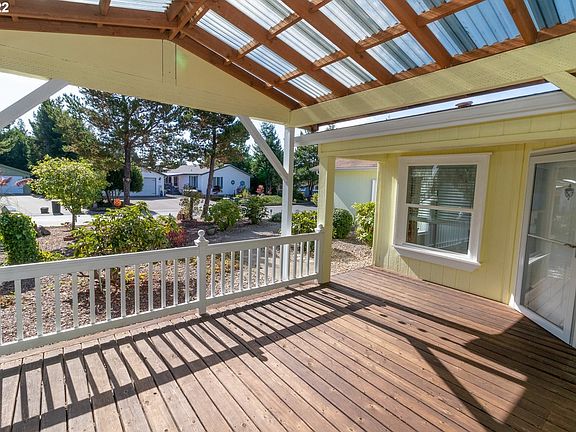 "Super Good Sense" Golden West 3 bed/2 bath. Beautifully upgraded with Corian counters. 7' island, expansive cabinets, pantry, stainless appliances, with door out to glassed-in patio area for outside entertaining. Luxury vinyl planking in main living area.  Primary bdrm on opposite end w/upgraded bathroom, stone counters & new sinks, hi-rise toilet. Garage 24x24 finished and insulated w/work bench. 2 raised beds in backyard. Covered partially glassed in front porch.