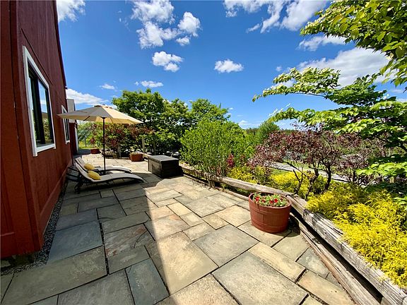Meticulously crafted Yankee Barn home nestled on 5.15 picturesque acres. This 5-bedroom, 2.5-bath home seamlessly blends classic charm w/ modern amenities, offering a unique living experience. Inside, you are greeted by the grandeur of the great room, w/ soaring ceilings, exposed timber beams, & a cozy wood-burning stove & fireplace. A family room w/ French doors leads you to a magical oasis of flowering plants & shrubs, creating a serene environment. The updated custom kitchen offers quartz counters, a tiled backsplash, & custom cabinetry. A main-level primary bedroom features a custom en-suite bath & tiled walk-in shower. Upstairs, find 4 bedrooms that can serve as guest rooms, home offices, or creative spaces, w/ a shared hallway full bath. A 2-car garage provides ample space for vehicles & an electric car charger, while 2 pristine outbuildings provide storage, workshop space, & stalls for horses or other animals. This home is equipped w/ state-of-the-art solar panels, flagstone patios, multiple gardens, fenced-in back yard, & breathtaking distant views. This Yankee Barn home is more than just a house; it's a lifestyle. Your dream home awaits! Open House 6/8 11:00 -1:00