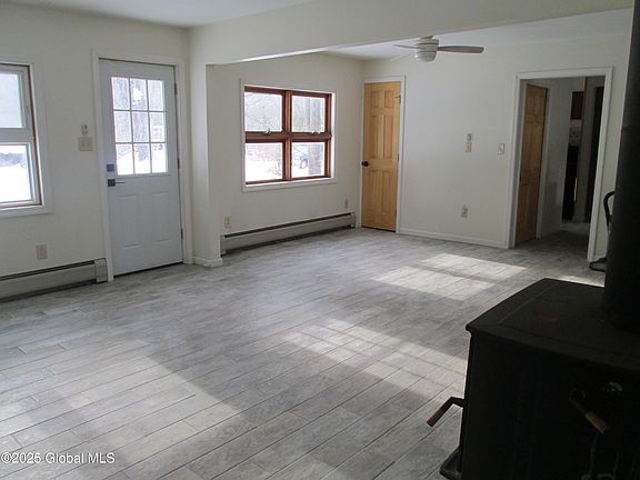This spacious ranch style home has been upgraded in the last two years. New flooring throughout, sheetrock, freshly painted, updated boiler system. Open concept with large master bedroom suite with new full bath, second bedroom has full bath, Laundry area in basement, Kitchen has lots of storage and opens to the dining room which is open to the living room with Pine Lake wood stove, built in oversized two car garage, storage shed and 2.5 acres