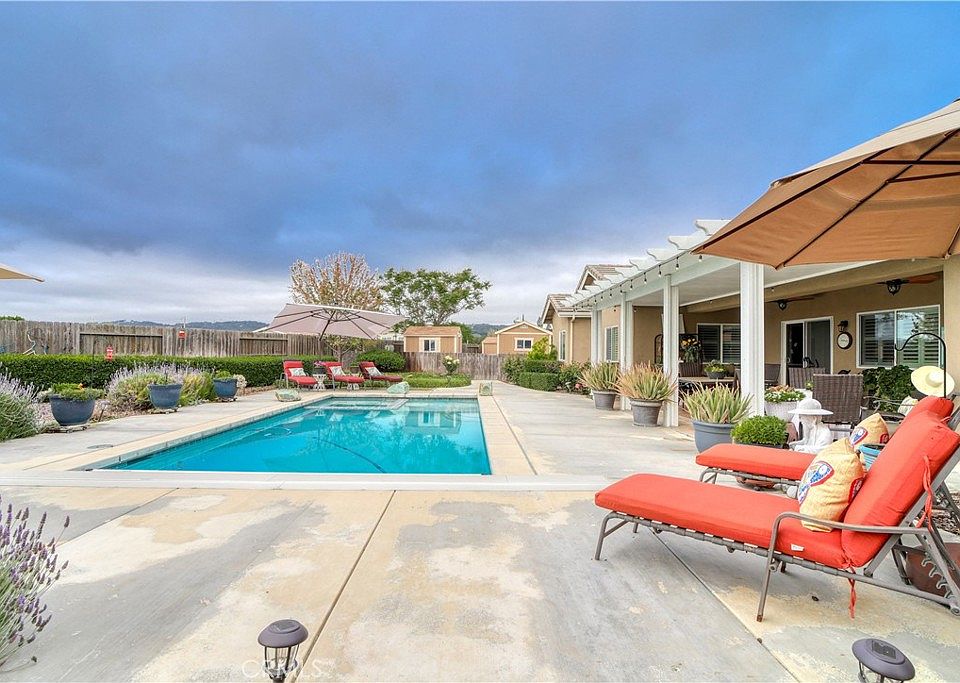 Immaculate single-level gem nestled on the west side of Templeton, on a quiet cul-de-sac. Boasting 4 bedrooms and 2.5 baths within its 2090 sq ft of interior space and situated on a 17,424 sq ft lot, this residence epitomizes comfort and style. Discover an inviting open floor plan where the kitchen, adorned with granite counters and a center island with bar seating flows seamlessly into the dining area and living room, complete with a cozy gas fireplace, perfect for gatherings or quiet evenings in. Sliding glass doors reveal your own private oasis in the backyard, complete with a refreshing pool and spa, surrounded by generous patio spaces ideal for entertaining or basking in the sun. The primary bedroom is strategically positioned off the living room, away from the other bedrooms offering a peaceful retreat. Pamper yourself in the luxurious primary bath, featuring a separate shower enclosure and an indulgent soaking tub. Two additional guest rooms down the hall share access to a full bath, while the fourth bedroom, currently utilized as a den, enjoys a prime location at the front of the house. Convenience is key with a 3-car attached garage providing ample storage and parking space, complemented by RV/Boat parking along the side of the house. Outside, lush landscaping and greenery create a resort-like ambiance, inviting you to relax and unwind in your own slice of paradise. Trader Joe's, great seafood at Pier 48 and other shops just a block away, and just minutes to downtown Templeton, offering a vibrant Farmers Market and Concerts in the park. Enjoy the best of both worlds with easy freeway access for commuting plus close proximity to renowned wineries, great hiking and biking trails, a popular dog park and fabulous beaches less than a half hour away.