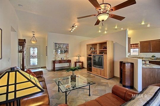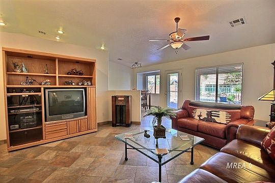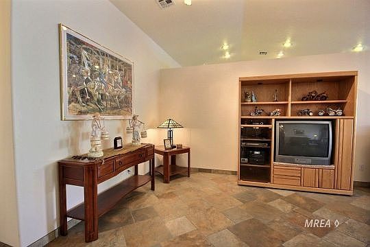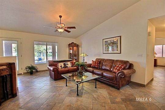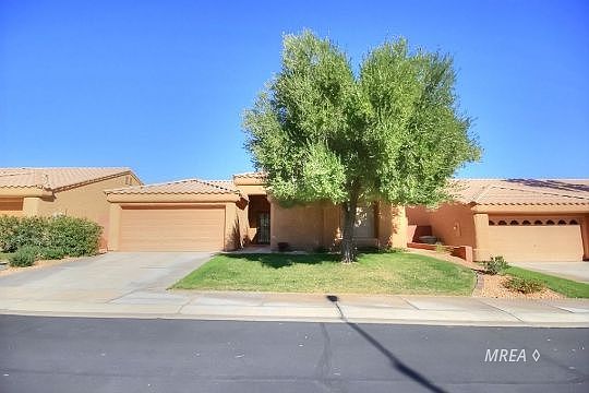 This property is located in the gated community of Copper Bluffs. At the front entry, you are greeted by a beautiful cut glass front door. As you step inside, you will find a large open living area with vaulted ceilings and upgraded lighting and fans. The kitchen is nicely appointed with granite counter tops, and lots of recessed lighting. This home boasts a large Master bedroom with walk-in closet and a custom tiled shower. The guest bedroom also has a large walk-in closet and the third bedroom can double as Den/Office. Another great extra of this home is the large outdoor living area, great for entertaining or to just relax. Other extras in this home are Upgraded custom tile flooring throughout, Sun Screens, Glass Security Doors on the Front & back doors, Samsung Washer & Dryer and Water Softener. Surprisingly low HOA Fees afford you the amenities of the Mesquite Vistas Country Club and includes Swimming pool/hot tub, Fitness facilities, tennis courts, restaurants and more, just a short walk from your new home. Some furnishings can be purchased outside of escrow.