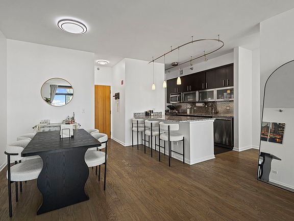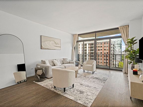 Parking Included! Breathtaking Panoramic Skyline Views from This Immaculate River North Condo! Perched on the 12th floor of the luxurious Erie Centre, this stunning 2-bedroom, 2-bath residence offers floor-to-ceiling windows in every room, flooding the home with natural light and showcasing sweeping city views. Step into a spacious open-concept layout with stylish laminate hardwood floors throughout and an expansive living/dining area that leads to your private balcony-ideal for relaxing or entertaining. The updated kitchen is equipped with granite countertops, 42" mocha cabinetry, stainless steel appliances, an island with seating, and generous storage space. The large primary suite features two large walk-in closets and an elegant en suite bath with a walk-in shower. The second bedroom is equally spacious, with continued skyline views and ample closet space. Additional highlights include in-unit washer/dryer, extra storage, and a well-maintained full-amenity building offering a chic lobby, 24-hour doorman, fitness center, party room, rooftop deck, and elevator access. Prime River North location-steps from CTA, Starbucks, Larrabee Dog Park, shopping, and many of Chicago's best restaurants and nightlife. Don't miss this rare opportunity to own a luxury condo with iconic views in one of the city's most vibrant neighborhood!