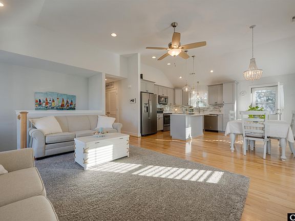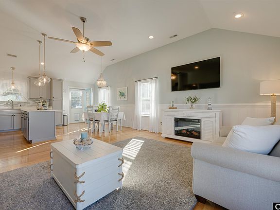 You will love this light-filled, secluded home within walking distance of Bay Drive and Kitty Hawk Bay! The owners have meticulously maintained this home and added a storage shed, fencing and multiple outdoor areas. Walk-in to the first level and there is a recreation/TV room with a wet bar that has a quartz countertop, floating shelves, and icemaker.  Definitely a great area to entertain. With the additional bedroom and full bath on this level, the area could be a mother-in-law suite or guest suite area. As you walk upstairs to an open great room notice the beautiful wood flooring on the stairs and throughout the upper level. The Great Room has an abundance of light with kitchen, dining and living areas. You will find a modern kitchen with an large island, stainless steel appliances and quartz countertop. Plenty of room to prepare a meal, entertain guests and watch TV. This area has access to a covered deck to where you can sit and enjoy the afternoon sun and a back deck. As you continue down the hallway the Owners Suite on the right includes a walk-in closet, tiled shower, quartz countertop and ceramic tile floor. There is a guest room with access to it's own full bath.  The laundry closet off the hallway provides convenient access for towels and linens. Notice the wood trim, light colors and upscale finishes throughout the home.