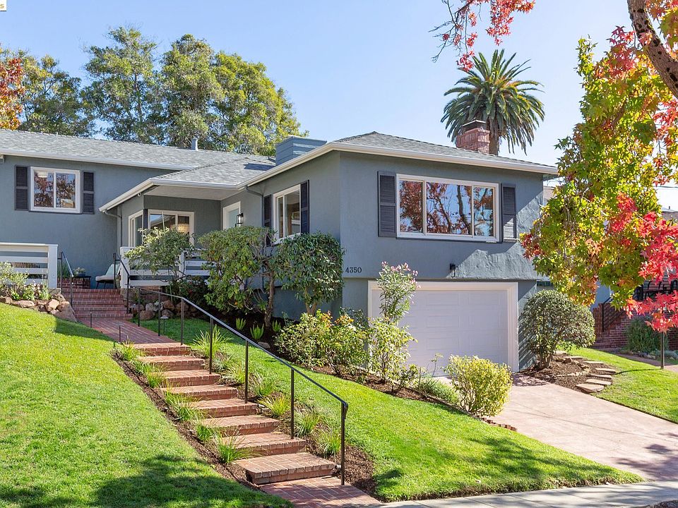 On the market for the first time in over 50 years is this light-filled 1940’s split level gem. A touch of New England with its glorious fall color from the tree-lined cul-de-sac sets the stage for a warm and welcoming retreat just a few blocks from the heart of the neighborhood… the local elementary school and community center. Deco finishes including rounded corners and glass panels add drama to newly refinished light wide-plank floors. A brick pathway leads to a large front patio, the perfect perch to hang out to greet neighbors and watch a fall sunset. The foyer opens to a light-filled living room with picture window and dramatic curved fireplace. Bullnose corners soften the transition to the intimate dining room, enhancing the flow between the public spaces. The eat-in kitchen enjoys light from a picture window and skylight and features a 5-burner gas range with separate griddle, Subzero refrigerator and counter seating. Up a few steps are 3 bedrooms and 2 baths, including a primary suite with a walk-in closet and spa-like bath including a jetted tub for two, walk-in shower and 2 vanities. The private backyard enjoys a level lawn area for play, mature citrus and a flagstone patio. Urban conveniences are at your fingertips with Peets Coffee, CVS and Safeway a 1/2 mile away.