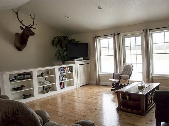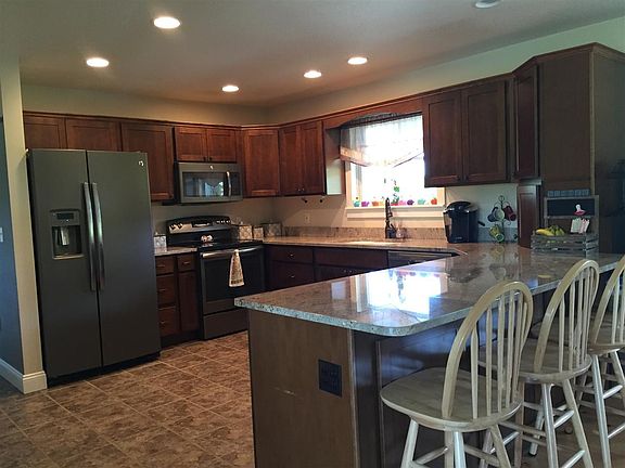 Beautiful ranch home built in 2014, situated on 2.5 acres & features 5 bedrooms, 3 1/2 baths & an open floor plan. The home includes granite counter tops & stainless appliances, maple & tile flooring, master bedroom suite with large walk-in closet, finished lower level with family room, full bath, 2 bedrooms and plenty of storage, a covered front porch, built-in book shelves, sprinkler system, large deck & on-demand hot water. Located only 3 miles north of town in a peaceful setting.