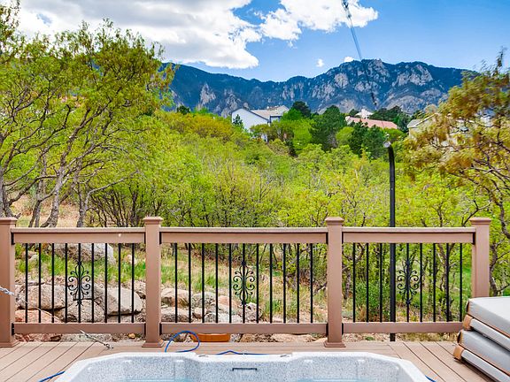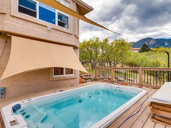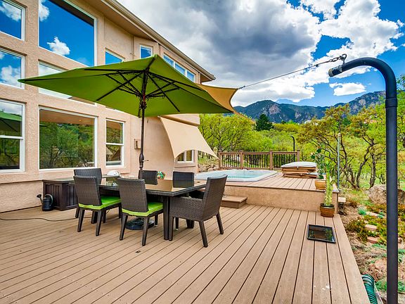 Absolutely exquisite 5-bedroom custom home nestled against Cheyenne Mountain with soaring cathedral ceilings, 2-story walls of windows, chef's kitchen with slab granite and stainless-steel appliances, formal and informal dining areas, luxurious master retreat with beautiful spa-like bath, steam room with waterfall shower, and a beautiful private deck surrounded by pines and oak trees with a magnificent 8x15 heated swim spa, no neighbors behind, and beautiful views of sunsets over Cheyenne Mountain. Other home features include a tiled main-level laundry area, oversized garage with incredible storage, new insulated garage door, central A/C, new hot water heater, new gutters and fascia, storage shed, front Trex porch, low maintenance stucco exterior, and designer touches throughout. Located on a quiet cul-de-sac within walking distance of award-winning D-12 schools, this exquisite home offers spectacular indoor and outdoor living spaces. See this gem today!