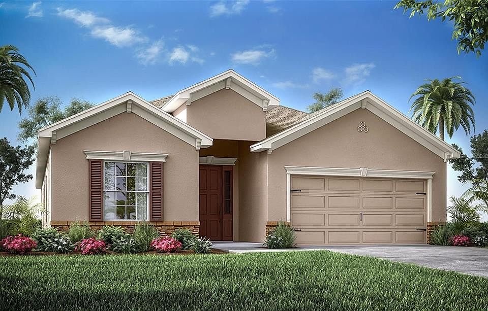 Under contract-accepting backup offers. Under Construction. New construction home with 2029 square feet one-story including 4 bedrooms, 2.5 baths, and an open living area. Enjoy an open kitchen with Quartz countertops, Samsung stainless steel appliances, pantry, and a spacious counter height island, fully open to the dining café and gathering room. The living area, laundry room, and baths include luxury wood vinyl plank flooring, with stain-resistant carpet in the bedrooms. Your owner's suite is complete with a walk-in wardrobe and a private en-suite bath with dual vanities, a tiled shower, and a closeted toilet. Jack-and-Jill Hall bath with an enclosed tub and toilet, accessed from bedrooms 3 and 4. Plus, enjoy a covered lanai, 2-car garage, custom-fit window blinds, architectural shingles, energy-efficient insulation and windows, and a full builder warranty. Please note, virtual tour/photos showcases the home layout; colors and design options in actual home for sale may differ. Furnishings and décor do not convey.