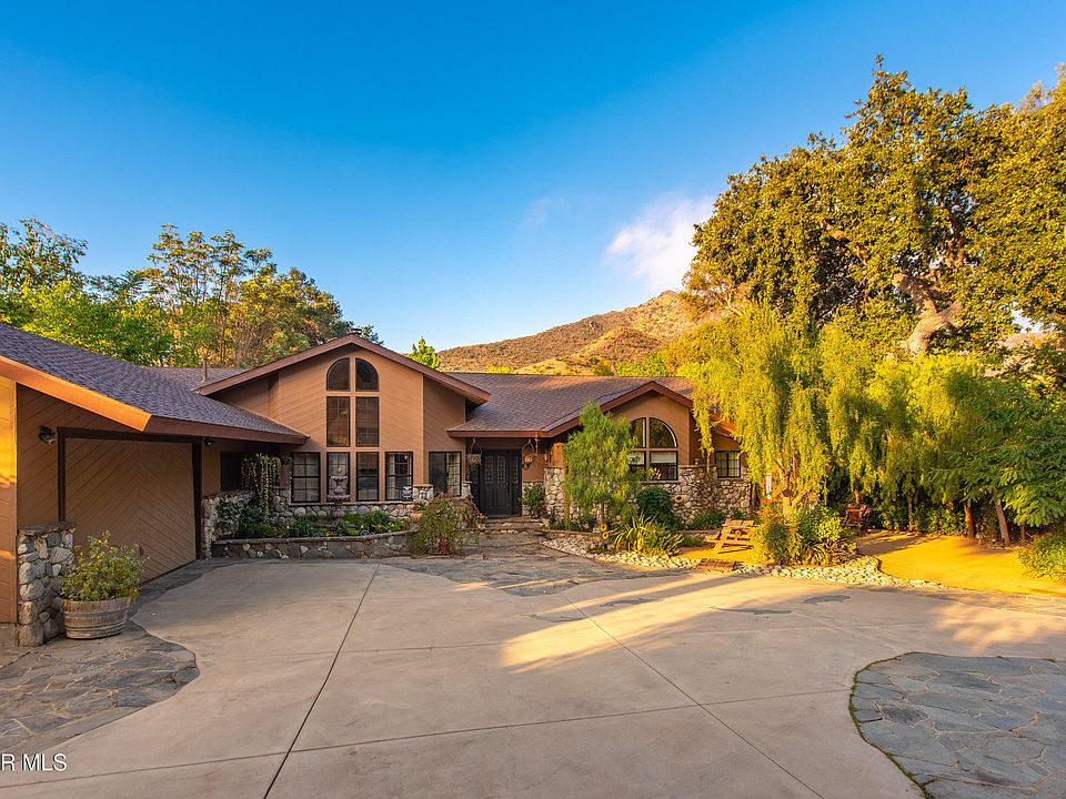 Nestled in Agoura Hills, this custom single-story home offers a rare blend of rustic modern style and serene country living. Set against sweeping views, the property is thoughtfully designed with lush landscaping, privacy, and chicken coops—perfect for those seeking both comfort and connection to nature. Inside, soaring ceilings and a light-filled living room create an open and inviting atmosphere. The kitchen features a central island, stainless steel appliances, and seamless flow for entertaining. The primary suite is a retreat of its own, boasting high ceilings and a spa-like bathroom with striking stack-stone walls and rich wood finishes. Additional baths include a spacious dual-vanity hall bath with a tub/shower combo, convenient full bath off the garage, plus a large half bath for guests. Outdoors, a sprawling pergola sets the stage for dining and entertaining, surrounded by mature landscaping that enhances privacy and beauty. A finished garage adds versatility for storage or creative use. This property is the ideal balance of modern comfort and rustic charm in a sought-after Agoura Hills setting.