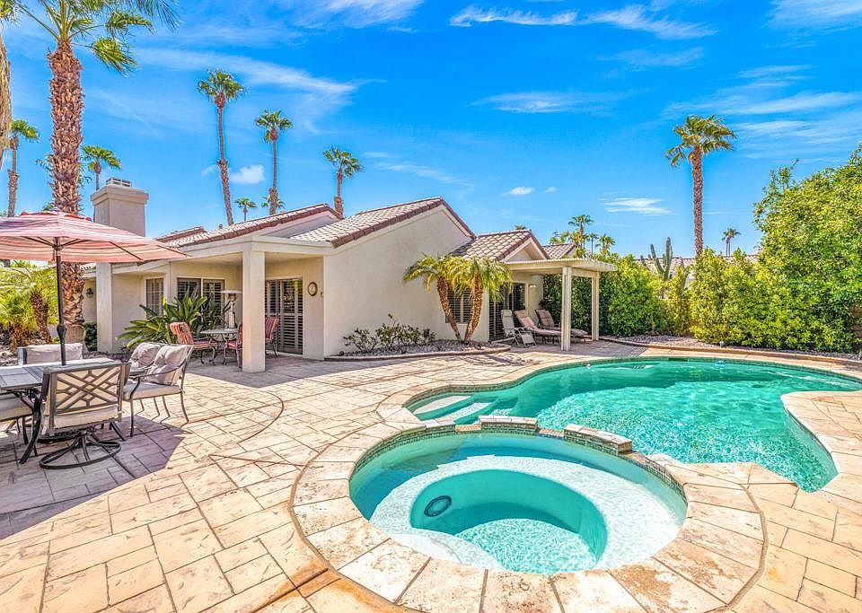 This beautifully remodeled and turnkey furnished POOL HOME is one of the largest floor plans within the Desert Breezes community offering 1,895 square feet, three bedrooms *plus den/optional 4th bedroom*, two bathrooms with a backyard oasis that will make you never want to leave! This spacious, light-filled home features a living room with cozy gas fireplace, built-in wet bar PLUS an adjacent family room with slider door access to the oasis-like backyard. The family room can also be transformed into a 4th bedroom/home office. The master suite includes high ceilings, large slider door leading to the backyard and features the completely upgraded master bathroom with back-lit mirrors, tile shower, sunken bathtub, newer cabinetry and large walk-in closet with custom shelving. The two spacious guest rooms provide ample closet space with shelving & ceiling fans. Guest bathroom has been remodeled top to bottom featuring a back-lit mirror, modern plumbing fixtures & large shower/tub. The upgraded kitchen comes fully equipped with stainless steel appliances, beverage fridge, newer cabinetry, recessed lighting & enjoy your mornings at the light-filled breakfast nook. Relax on the covered patio & enjoy the cool desert nights in this gorgeous backyard oasis with large salt water pool/spa, lush landscaping & misters. Conveniently close to restaurants, shopping & Indian Wells Tennis Garden. HOA includes clubhouse, fitness center, lighted tennis courts, 24-hour gate & front landscaping.