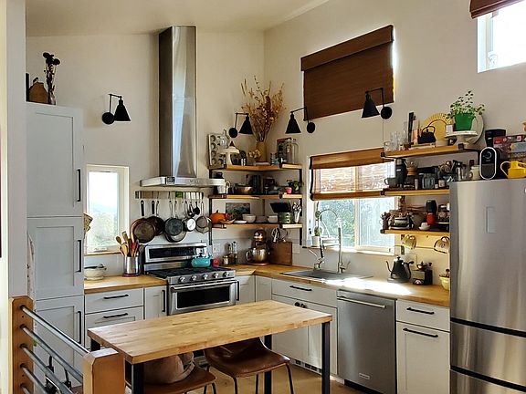 2-story home with mountain and valley views. 2 bedrooms downstairs with a modern glass walk in shower. The kitchen and living space are upstairs to take in the 360 views. Enjoy a chef inspired kitchen and wood burning stove in the open living space. A large soaker tub overlooks the Sangre de Cristo mountains behind the home. The bedroom upstairs can be used as an office, small bedroom or exercise space. The home was built in 2019 so it includes modern fixtures and appliances. A large fenced in yard provides plenty of room to move about plus it comes with a 9x7 storage shed. Concrete floors downstairs with engineered hardwood floors upstairs. Perfect spot for remote workers with high speed internet. The property is lightly furnished. Utilities included. Utilities included in monthly rent (water, gas, electric, internet, trash). Renter will need to source wood if utilizing the wood burning stove (not recommended to use between May-October). Furnishings included - 1 queen bed set with end tables, 1 desk + desk chair, 1 day bed that converts into a queen bed, 2 living room chairs w/ coffee table, 1 kitchen table w/ 2 chairs. 1 pet is allowed - either a cat or a small dog. A non refundable pet fee of $300 is due upon signing the lease. No smoking inside the home. Smoking permitted outside of the home. Please be kind and remove all evidence of smoking from the property. A fee of $100 will be due at the end of the lease for any clean up required. Parking in driveway for 2-3 vehicles.