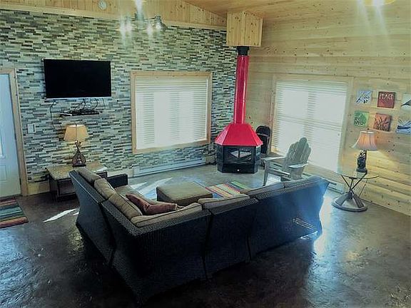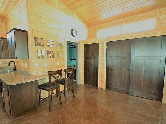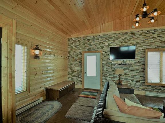 Now is the time to invest in this picturesque lake cabin on 5 acres - perfectly located for fishing, upland game and bird hunting. You will enjoy the high quality solidly constructed cabin built in 2012 with all its modern amenities along with its nearby lakeshore access to Green Lake where there's room for a private boat dock. It has 10' walls with beautiful knotty pine log siding along with knotty pine vaulted ceilings, a stone panel accent wall and a wood burning stove. The cabin includes a full modern kitchen, large dining space and living room, a queen size murphy bed with all furnishings included. The bathroom doubles as a storm shelter with 8' concrete walls and the floors throughout are maintenance free stamped concrete. It is also all set for you to invite your guests to stay with RV sites including 2-50 amp and 2-30 amp outlets, and water and sewer hookups. Property has paved county road access. Green Lake spans 978 acres. Sellers are willing to include boat dock with acceptable offer.