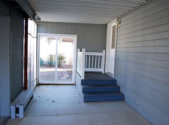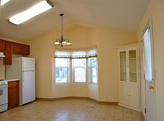 Well kept home in clean 55+ park. Cathedral ceilings throughout. Ceiling fans in master bedroom and living room. Built-in bookshelf and corner cabinet. Bay window in kitchen/dining area. Good sized covered patio. Small garden area inside landscaped yard with sprinkler system.