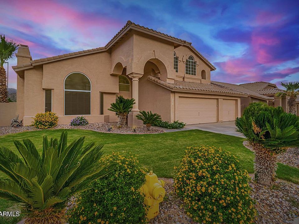 Beautiful two story home sits on a private corner lot with mountain views. Five bedrooms, 3 full baths and oversized 3-car garage with cabinetry. Two newer (2018) HVAC units, newer water softener, water heater and newer roof! The backyard features a recently updated pebble sheen finish pool, with water feature and newer pump. Firepit, plenty of seating vignettes and space for entertaining. Owners have taken pride of ownership in this home.As you enter the home you will notice the graceful stairwell, living room with fireplace that opens to the formal dining area. The kitchen and family room open to one another and are spacious allowing plenty of room for family and friends. The kitchen features granite slab countertops, SS appliances with brand new microwave, kitchen island, pantry and