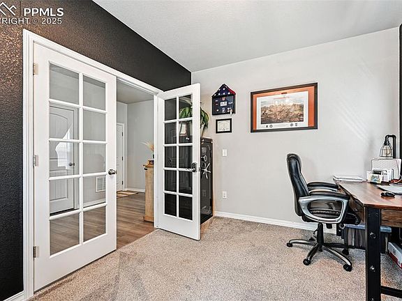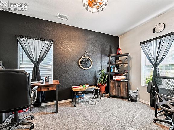 Welcome to this beautiful two-story home located in one of Colorado Springs’ most desirable neighborhoods. This spacious property features 4 bedrooms, 2.5 bathrooms, and a three-car tandem garage, offering plenty of room for comfortable everyday living. Inside, you’ll find a dedicated home office ideal for remote work, a formal dining room, and an open-concept main level that’s perfect for entertaining. The modern kitchen stands out with a large island, granite countertops, stainless steel appliances, and abundant cabinetry. It flows directly into the bright living room, creating a seamless space for gatherings. Upstairs, the primary suite delivers the retreat you’ve been waiting for an oversized bedroom, spa-like bathroom with soaking tub, stand-up shower, dual sinks, granite countertops, and a spacious walk-in closet. Three additional bedrooms and a full bathroom sit nearby, along with a generous loft that works great as a second office, game room, playroom, or lounge. The backyard is a true highlight. Enjoy an oversized lot with mature trees, an extended concrete patio, no rear neighbors, and direct access to a nearby park and walking trails. A storage shed provides extra convenience for outdoor gear. With its functional layout, premium finishes, open floor plan, and unbeatable location near top Colorado Springs amenities, this home checks every box for comfortable living and entertaining.
