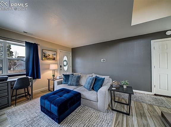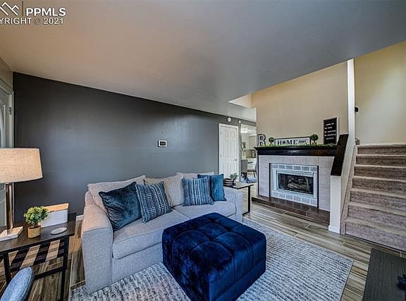 Charming 2 story home opens to the living room with a tile surround gas fireplace, high ceilings and oversized windows which provide plenty of natural light. The beautiful ceramic tile flooring continues throughout the entire main level. The eat-in kitchen boast beautiful parker style white cabinetry, granite countertop, mosaic tile backsplash, a pantry and stainless steel appliances. The eat-in dining area also features a beautiful shiplap accent wall and walk-out into the backyard. The backyard is fully privacy fenced and features a concrete patio and room for large picnic table making it great for entertaining. Upstairs you will find the large master bedroom with a walk-in closet as well as the spacious second bedroom and full bath. Bathroom features a large vanity and subway tile around the shower/tub. This home has beautiful design touches throughout. Convenient to Ft. Carson, Peterson AFB, and dining. This one won't last long!