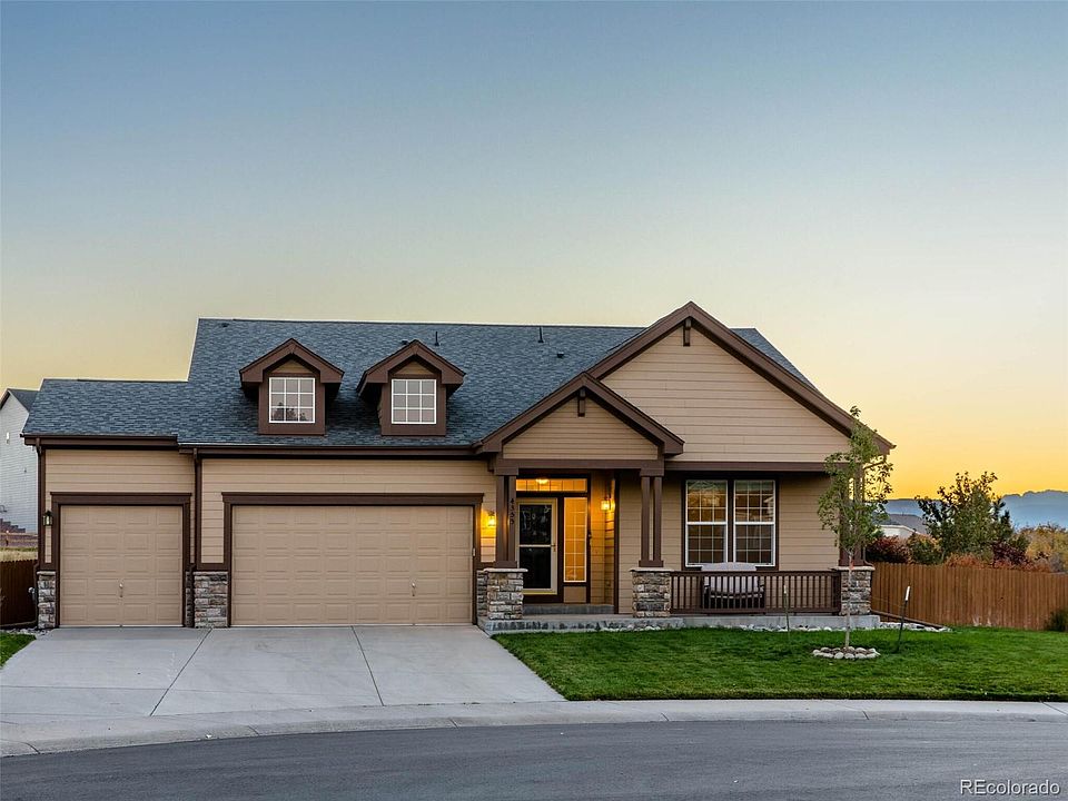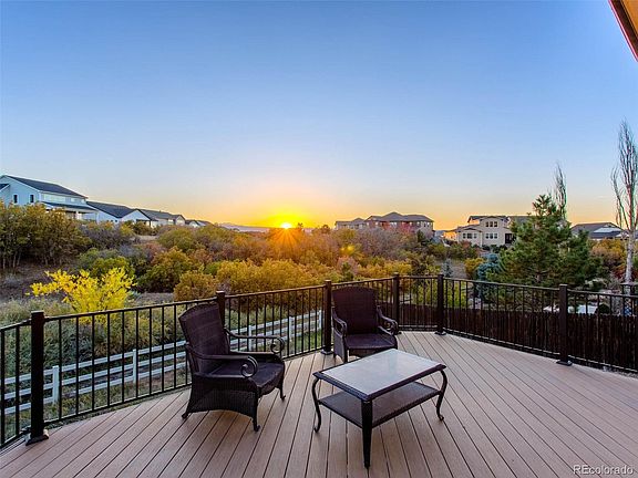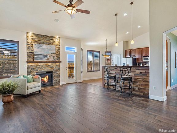 Under a 14-foot vaulted ceiling, the great room features a gas fireplace accented with stacked stone tile and wood mantle, all illuminated by extra lighting and custom shutter on the windows. Flow into the kitchen for seamless entertaining where ample prep and storage space allows you to easily prepare meals for gatherings of any size. Accented with custom reclaimed wood paneling, the countertop bar is the perfect place to grab a quick snack while the formal dining and kitchen eat-in offer a more formal, meal time setting. Large windows fill the primary bedroom with light and a custom paneled wall with a sliding barn door leads to the 5-piece ensuite with a large walk-in closet. The unfinished basement with additional crawl space allows for extra storage or transform it into a space that fits your needs. Enjoy the fantastic and friendly community close to downtown Castle Rock with an easy commute to Denver and Colorado Springs. **Showings will start after 3pm Monday, October 17.