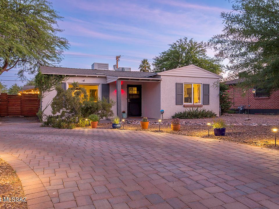 A Poet's Square/Corner gem. This thoughtfully updated 1948 abode has all the charm, functionality and comfortable spaces in a quaint and established central / midtown Tucson neighborhood. Close to many restaurants, coffee shops, parks, retail shops & venues, and this home is within walking distance to quite a few. This home sits on an elevated corner lot with a north facing picturesque mountain view, and a circular driveway. The classic design touches in this home are timeless and beautiful throughout. Enjoy the split floor plan that provides a generous primary bedroom, bathroom and large walk-in closet, and three additional spacious bedrooms and a full bathroom. Along with a chef's kitchen at the heart of the home. The beauty of this home extends to all the outdoor spaces. There is a fully bricked, covered back patio, landscaped and manicured front and backyard with fruit trees (lemon, lime & fig), all on a rainbird irrigation system. The perfect little oasis in the desert.