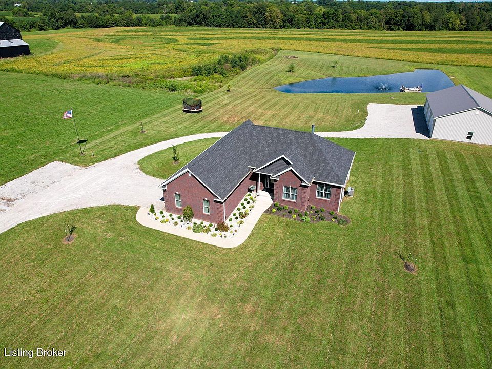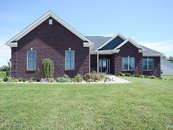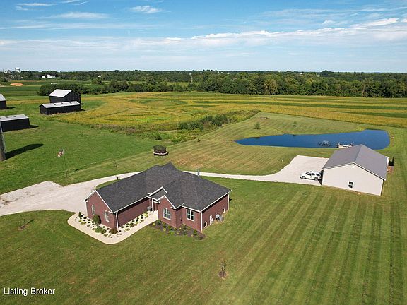COUNTRY ESTATE...CUSTOM BUILT...OPEN STYLE...This 4 Bedroom, 3 Full Bath All Brick Ranch Home with a Full Basement has that and much more! Located on approximately 5 Beautiful Acres, this property has everything you could want...From the Beautifully Stylish Interior to the Lusciously Landscaped Property to the 40 x 60 Outbuilding/Garage to the Stocked Pond. Enter by way of a Large Covered Front Porch into the Foyer Flanked by a Formal Dining Room on one side and the Magnificent Great Room beyond with Crown Moulding and a Beautiful Stone Wood-Burning Fireplace. The Spacious Kitchen Boasts Granite Countertops, Custom Cabinetry, Tile Backsplash, a Center Island, Stainless Appliances, and a Roomy Pantry.