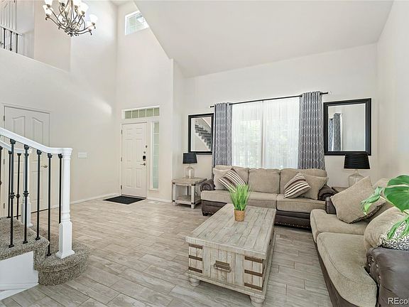 Light and bright two-story home tucked away in The Village with gorgeous updates! Step inside the front door and be immediately wowed by the soaring vaulted ceiling, updated tile flooring, fresh neutral paint, new carpet, and brilliant natural light. Designed with entertaining in mind, the beautifully-appointed main floor offers both formal and informal living and dining spaces. A formal living room and dining room off the foyer are perfect for more special occasions while the open concept kitchen, breakfast nook, and family room are ideal for everyday life. Everyday luxury awaits in the remodeled kitchen that boasts stunning quartz countertops, a peninsula with counter seating, a pantry, crisp white cabinets, sleek black hardware, and stainless steel appliances including a beverage fridge. The main floor is completed by a private bedroom perfect for guests, an updated full bathroom with lovely tile work, and a laundry room that connects to the three-car garage and doubles as a mudroom. Ascend the striking curved staircase to the upper level primary retreat that impresses with double door entry, a large bedroom with a vaulted ceiling, a five-piece bathroom, a walk-in closet, and a sitting room that makes a great nursery or office. Also on the second floor are two additional sizable bedrooms, a full bathroom with double sinks, and a flexible loft space.  The 1500+ sq ft unfinished basement provides options for storage or future living space. Also of note is the new furnace and the fenced backyard that awaits personalization from your green thumb. Wonderful location in a quiet neighborhood that is a few blocks away from parks and has quick access to I-76, shopping, dining, and Barr Lake State Park.