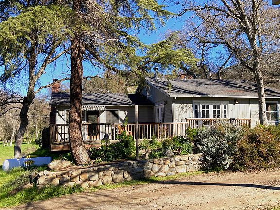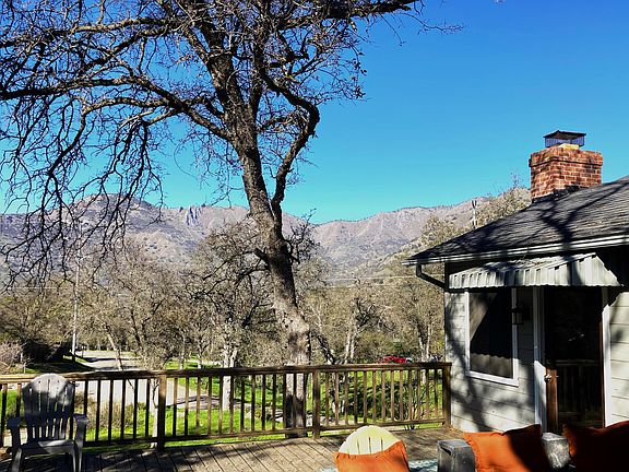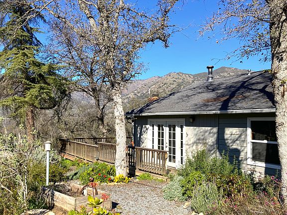 Welcome to this comfortable and cozy 3 bedroom 1.5 bathroom home on 3/4 acre lot with abundant character and outdoor living potential. While the property feels private and secluded, it is minutes away from the entrance to Sequoia National Park, Case Mountain Recreation Area and the heart of Three Rivers' shops and restaurants. Dual French doors bathe the living area, which featuring cork flooring, in plentiful natural light. The stone mantled wood-burning stove provides warmth and ambiance to the open floor living, dining and kitchen areas. Step directly from the interior living area to an expansive deck for outdoor living with gorgeous views of the surrounding foothills, perfect for relaxing or entertaining. The deck also features a separate entrance to the master bedroom which boasts a generous walk-in closet and half bath with custom stone tile flooring. The full bath and kitchen counter likewise boast custom stone tiling. Two guest bedrooms could easily be utilized as an office, gym or hobby room. An intermittent creek runs through the property and there is ample space to create your dream outdoor experience. The backyard is partially fenced for privacy and the garage features built in shelving for storage and a workbench for home projects. This is a perfect opportunity for a first, second or investment home in the wonderful town of Three Rivers at a fantastic price.