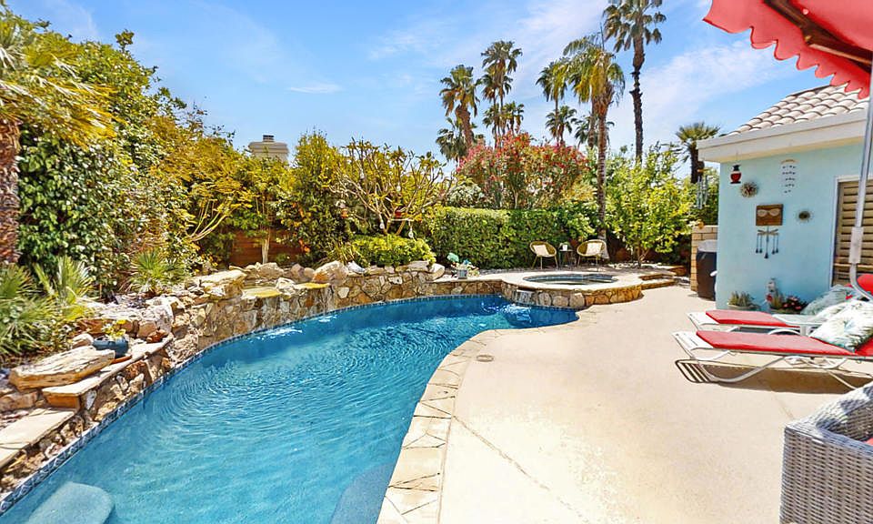 Private tropical paradise...Step through the front gate and be captivated by the resort-like lush grounds surrounding the large upgraded pool, waterfall and spa. Indulge in the ultimate indoor/outdoor living experience as you relax on the expansive covered wrap-around patio or wind down around the gas fire pit. Inside the home, discover the Antigua Floorplan, the largest in the community. Natural light floods through the glass patio doors, large windows and skylights into this vibrantly decorated home. This residence boasts 3 bedrooms and 3 bathrooms, ensuring ample space for family and guests. The remodeled kitchen is an entertainer's delight, featuring newer cabinets, a five-burner gas cooktop, and upgraded stone countertops; creating an ideal space for culinary creations and memorable gatherings. HVAC replaced in 2021. Embrace an active outdoor lifestyle. Whether you're seeking a full-time playground, a winter retreat, or an investment property for seasonal rentals, this rare gem offers endless possibilities. There is also an on-site hotel for overflow guests. Low HOA fees include the Desert Breezes Clubhouse with Fitness Centre and activity rooms, the main large and smaller community pools/spas, lighted tennis and pickleball courts, walking trails, 24 hour security, trash and front yard landscaping. Located near world renowned Indian Wells Tennis Garden, world class shopping, restaurants, golf courses, polo, theatre, casinos and the new Acrisure arena and concert venue.