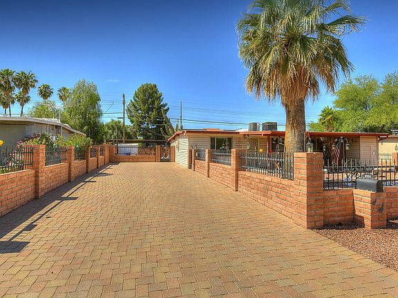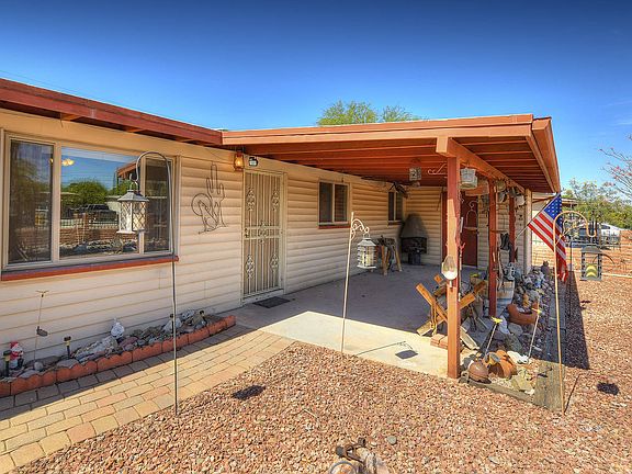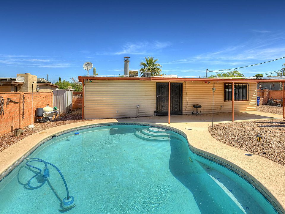 3 bedrooms and 1.5 bath rooms. 1,497sf with a POOL is move in ready! This block home has a family room with fireplace and a separate living room, both having access to the kitchen. Kitchen has gas cook-top and the refrigerator stays for your convenience. Air Conditioning plus Evap. Enjoy the large backyard with a pool, covered patio, 2 sheds and a huge saguaro that brings it all together. Decorative Chavez wrought iron door. .18 of an acre has a gorgeous paver driveway with lots of available parking. Washer & Dryer are included.