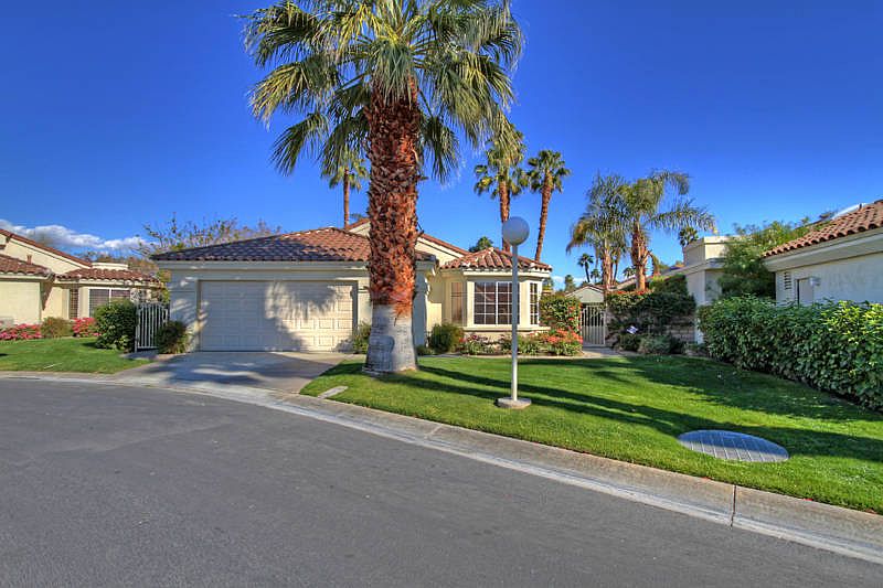 Sellers now want only their present homes in France and La Jolla. What has always attracted them to this home is it's quiet interior location within the complex. Also, the placement of the lot guaranteeing the owners all-day sunlight. The large grassy yard and garden is a gardner's dream. There is a backgate which opens to a large grassy greenbelt. Immaculate care and attention to maintenance abound everywhere both within and on the exterior. All major equipment is new or almost-new; also, new tile floors in the MBR and the baths. In addition, all rooms have just been painted awaiting their new owner. Desert Breezes is famous for it's tennis courts. In addition are pools, spas, a clubhouse, a fitness center, walking paths and much more. By night it appears to be an MGM movie lot/set with it's unusual globe lighting. All this for only $322 HOA and all is just a short walk to the Indian Wells Tennis Gardens. Hurry!