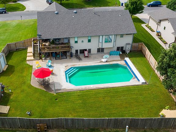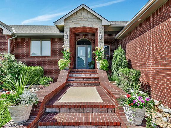 Welcome to your dream home in Cheney, Kansas! This meticulously crafted, custom-built one owner residence is a testament to timeless elegance and modern convenience along with an in ground pool for endless outdoor fun. Boasting 5 bedrooms and 3 bathrooms, this property sits on a generous .51-acre lot spanning two lots. Exterior has an impressive blend of brick and stone on its facade and siding on the remainder of the home is a true reflection of timeless design and curb appeal. Entering the foyer with tile and granite flooring to the open plan home and the living room with vaulted ceilings, designer niches, neutral colors, gas fireplace and wood floors. Dining room has tile floors, wall of windows and inviting atmosphere, allowing for effortless interaction between family members and guests. Kitchen has been thoughtfully designed with cabinet and prep space along with a walk in pantry. Primary bedroom has bay windows, ceiling fan and spacious walk in closet. Primary bath has been completely remodeled and it is impressive with tile walk in shower, tile floors, granite counter and soaker tub. Remainder of the main level are two bedrooms with wood laminate flooring and a full bath that has been updated with granite counters, tile surround tub and tile floors. Basement is a view out and the family room with the abundant square footage provides endless possibilities for creating cherished memories. Remainder of basement is two larger bedrooms (one with walk in closet), updated bath, storage room AND a storm safe room. No detail has been overlooked in this home like a central vacuum system, sconce lighting and ceiling fans throughout. Relax and unwind on the covered deck overlooking your in ground pool and patio where you can enjoy the picturesque views of your expansive fenced lot. For the hobbyist or tinkerer, the heated/air-conditioned shop provides the perfect retreat to work on your projects year-round. Additionally, the storage shed offers ample space to keep your outdoor equipment and tools neatly organized. Pool is a 18 x 34 Sport Pool with auto cover and all of the pool equipment remains. Irrigation well and sprinklers in backyard. Call for a showing today.